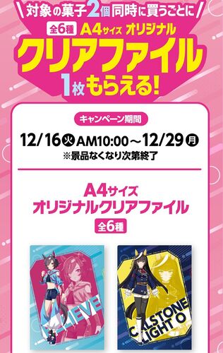 12月16日から12月29日の期間にファミリーマートにて対象のお菓子を2個同時に購入するとウマ娘のA4オリジナルクリアファイルが1枚貰えます。 僕は。。。昨日そのキャンペーンを知りまして。。。早速『きのこの山』と『たけのこの里』を2個ずつ購入。キン…